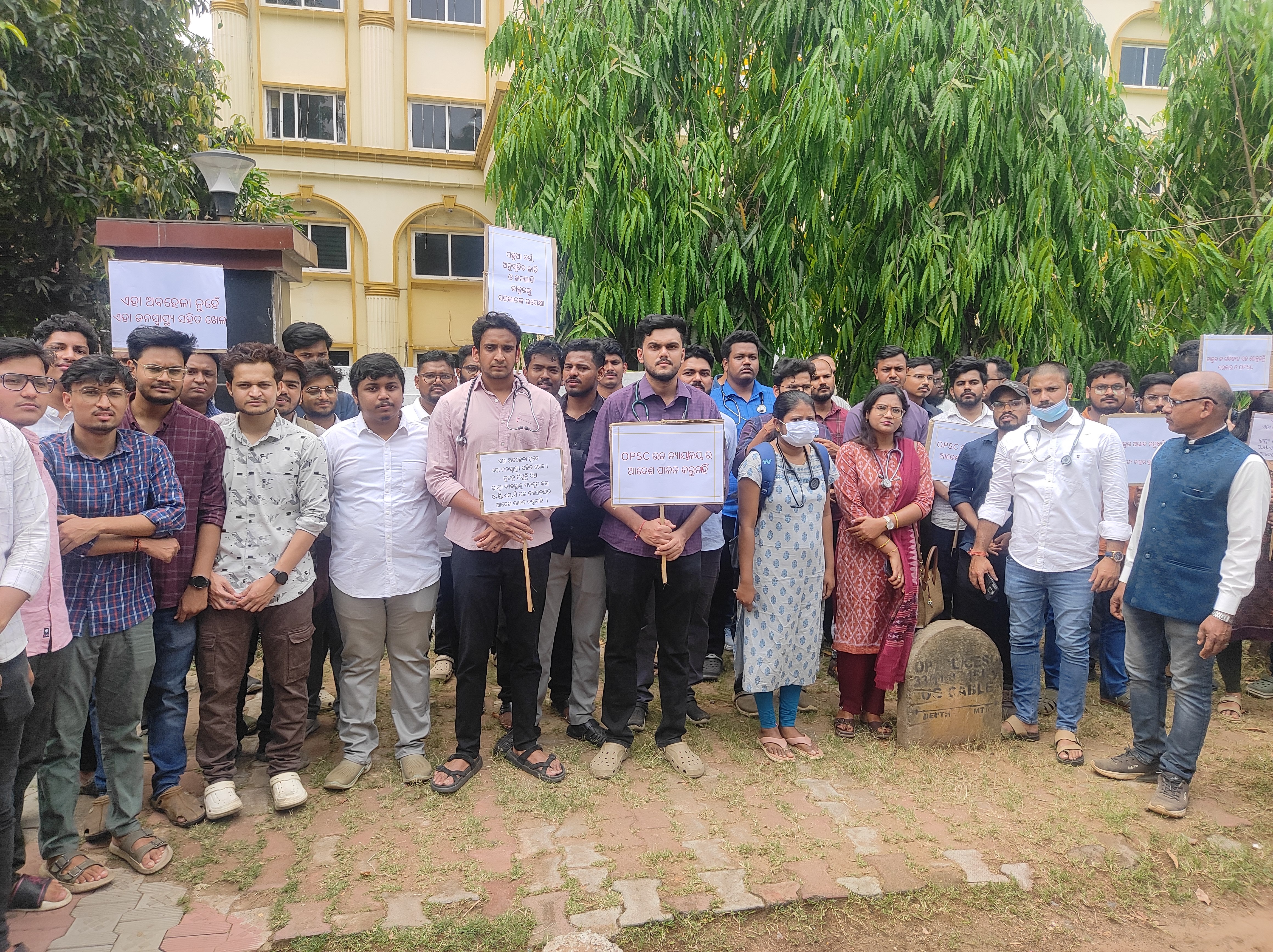 कटक, (निप्र) : कटक कैंटोनमेंट रोड स्थित ओपीएससी कार्यालय के सामने डॉक्टरों ने नियुक्ति ...