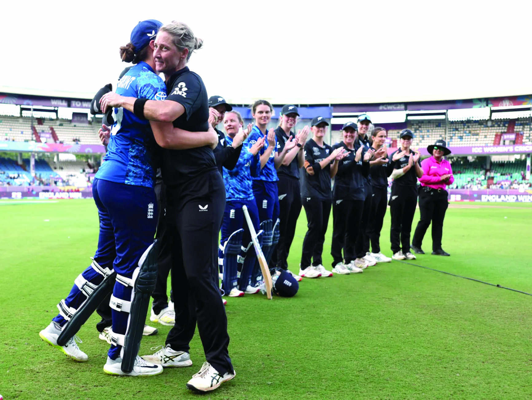 विशाखापट्टनम, (एजेंसी) : इंग्लैंड ने स्पिनरों के कमाल और एमी जोन्स की शानदार पारी की मदद से रविवार को यहां महिला विश्व कप के मुकाबले में न्यूजीलैंड को आठ विकेट से हराकर स्टार ऑलराउंडर सोफी डिवाइन की विदाई को यादगार नहीं बनने दिया। न्यूजीलैंड की कप्तान डिवाइन ने अपने अंतिम वनडे मैच में टॉस जीत कर पहले बल्लेबाजी का फैसला किया लेकिन उनके बल्लेबाज अपेक्षाओं पर खरे नहीं उतरे और उसकी पूरी टीम 38.2 ओवर में 168 रन पर आउट हो गई। इंग्लैंड ने दो विकेट पर 172 रन बनाकर 124 गेंद शेष रहते हुए आसानी से जीत हासिल की। जोन्स ने 92 गेंद पर नाबाद 86 रन बनाए जिसमें 11 चौके और एक छक्का शामिल है। उन्होंने टैमी ब्यूमोंट (40) के साथ पहले विकेट के लिए 75 रन और हीथर नाइट (33) के साथ दूसरे विकेट के लिए 83 रन की साझेदारी की। डिवाइन ने नाइट के रूप में अपने करियर का अंतिम विकेट लिया। इस जीत से इंग्लैंड 11 अंक लेकर अंक तालिका में ऑस्ट्रेलिया के बाद दूसरे स्थान पर रहा। इंग्लैंड पहले ही सेमीफाइनल में जगह बना चुका था जहां उसका सामना 29 अक्टूबर को गुवाहाटी में तीसरे नंबर की टीम दक्षिण अफ्रीका से होगा। दूसरा सेमीफाइनल इसके एक दिन बाद भारत और ऑस्ट्रेलिया के बीच नवी मुंबई में खेला जाएगा।