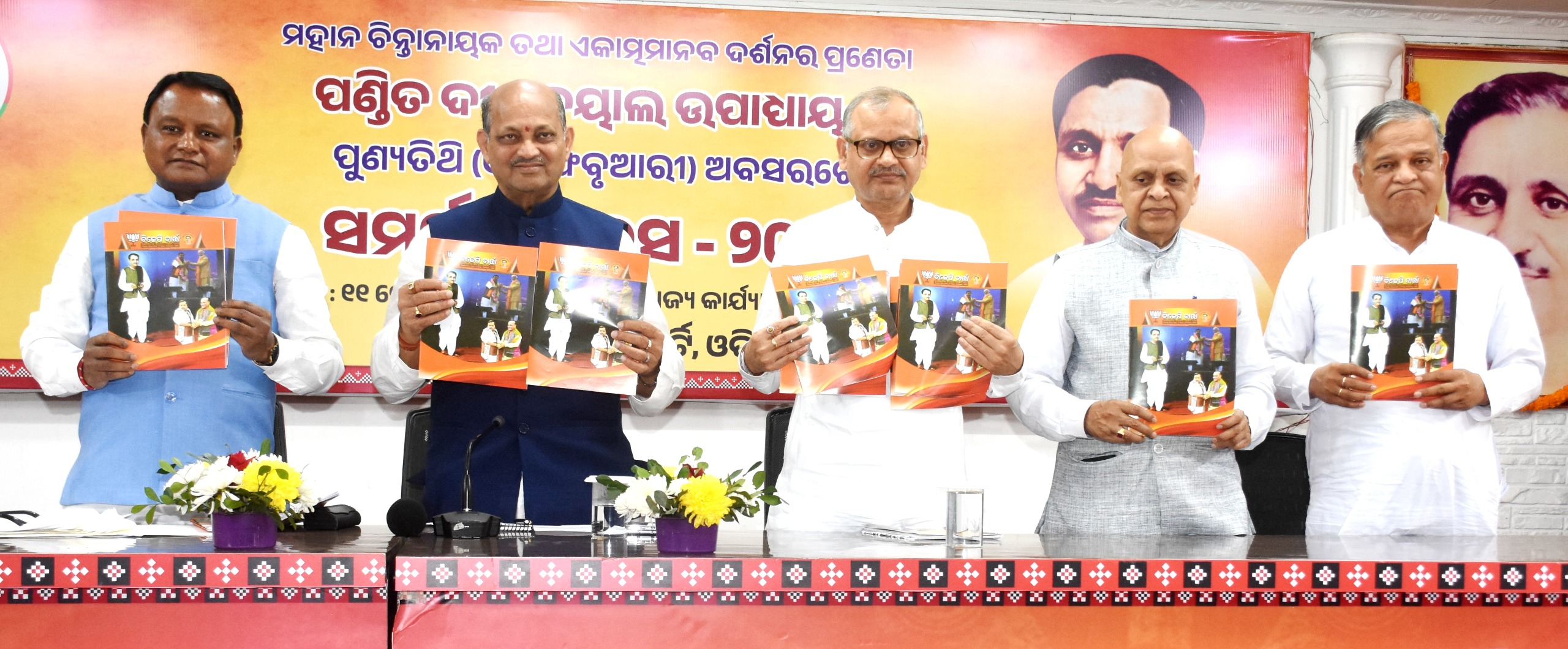 भुवनेश्वर, (निप्र) : राष्ट्रसेवा को समर्पित भारतीय जनसंघ के सह-सचिव पंडित दीनदयाल उपाध्याय की 58वीं पुण्यतिथि के अवसर पर भारतीय जनता पार्टी की ओर से राज्यभर में समर्पण दिवस मनाया गया। राज्य कार्यालय में आयोजित कार्यक्रम में मुख्यमंत्री मोहन चरण माझी ने कहा कि दीनदयाल का एकात्म मानववाद गरीबों के उत्थान का सर्वश्रेष्ठ मॉडल है।