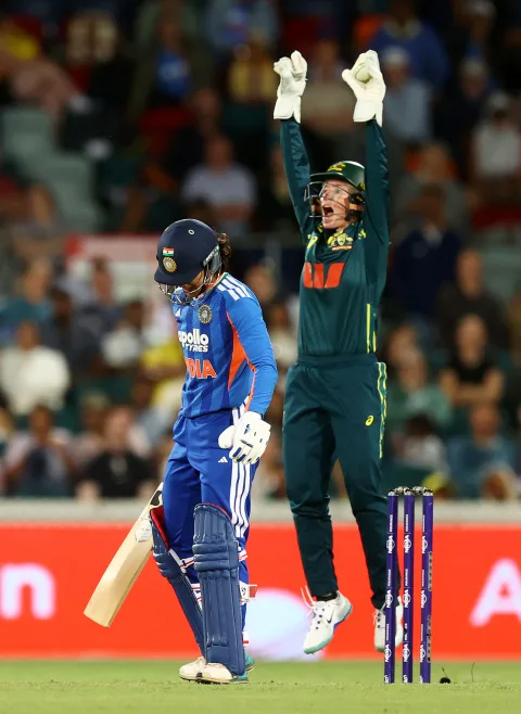 लगातार दो विकेट गिरने से भारत की रन गति धीमी पड़ गई। जल्द ही मंधाना के रूप में तीसरा विकेट गिरा जब वह गार्थ की गेंद पर मूनी को कैच दे बैठीं। भारतीय टीम ने तीन विकेट पर 71 रन बना लिए थे। तब कप्तान हरमनप्रीत और ऋचा घोष (19) ने मिलकर चौथे विकेट के लिए 55 रन जोड़े।हालांकि रन रेट बढ़ता जा रहा था जिससे भारतीय खिलाडिय़ों को जोखिम उठाने का खामियाजा भुगतना पड़ा। हरमनप्रीत को 17वें ओवर की दूसरी गेंद पर गार्थ ने आउट किया और तीन गेंद बाद घोष भी गार्डनर की गेंद पर स्टंप आउट हो गईं।