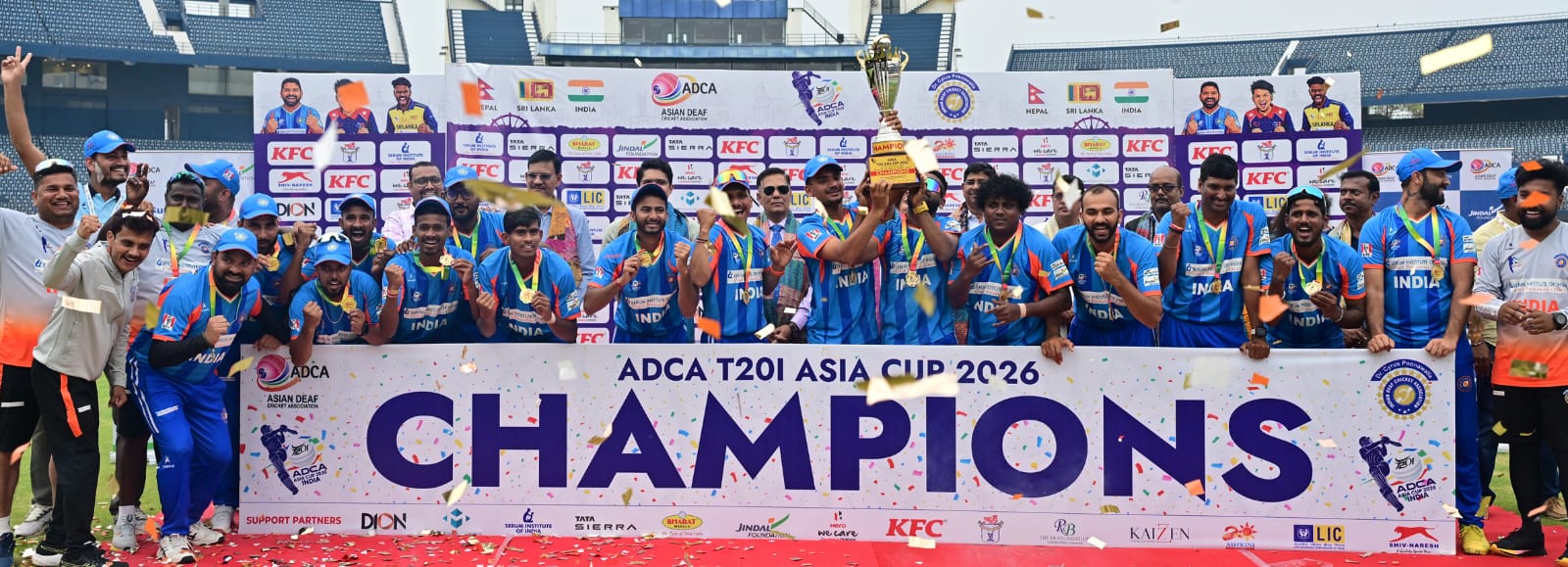 कटक, (निप्र) : एशिया बधिर क्रिकेट संघ, भारतीय बधिर क्रिकेट संघ और ओडिशा बधिर क्रिकेट संघ की ओर से कटक स्थित बारबाटी स्टेडियम में आयोजित बधिर एशिया कप टी20 क्रिकेट प्रतियोगिता में भारत ने शानदार प्रदर्शन करते हुए श्रीलंका को 6 विकेट से हराकर चैंपियन बन गया। बुधवार को खेले गए फाइनल मुकाबले में भारत ने टॉस जीतकर पहले फील्डिंग का निर्णय लिया और श्रीलंका को बल्लेबाजी के लिए आमंत्रित किया।