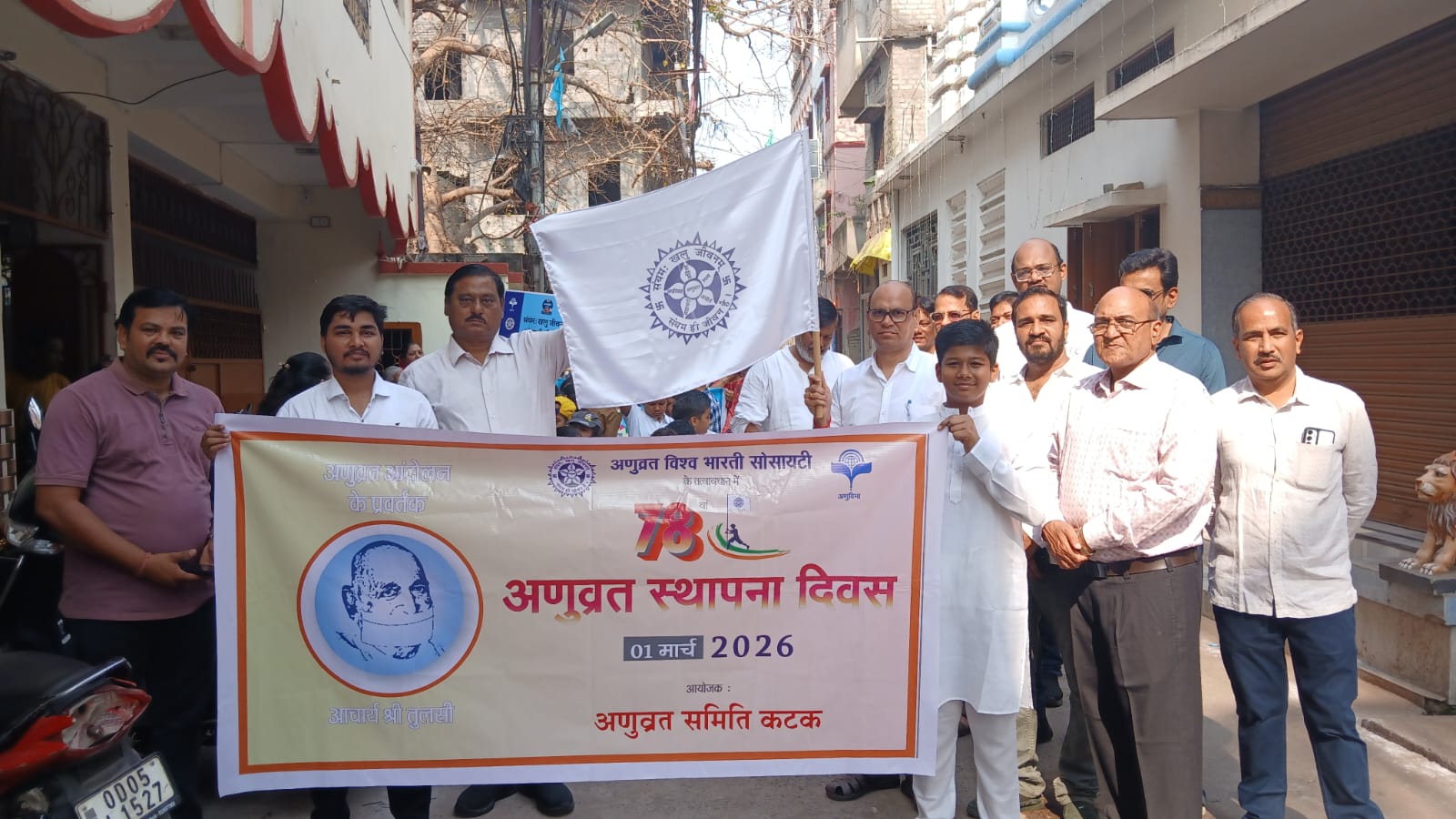 कटक, (निप्र) : अणुविभा के निर्देशानुसार अणुव्रत समिति कटक की ओर से सोमवार को 78वां अणुव्रत स्थापना दिवस समारोह स्थानीय तेरापंथ भवन कटक में मनाया गया। समिति की ओर से जन जागरुकता के लिए एक रैली भी निकाली गई। अणुव्रत के नारे, उद्घोष के साथ रैली में सभी संस्थाओं ने भागीदारी निभाई।