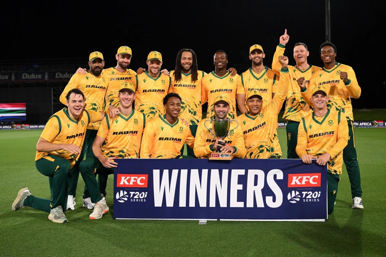दक्षिण अफ्रीका ने अपनी पारी में 47 डॉट गेंदें खेलीं, लेकिन टीम ने इसकी भरपाई 15 चौकों और 10 छक्कों से की। शानदार गेंदबाजी और कमाल के क्षेत्ररक्षण के सामने लक्ष्य का पीछा करते हुए न्यूजीलैंड की बल्लेबाजी लडख़ड़ा गई और टीम दबाव में आ गई। तेज गेंदबाज जेराल्ड कोएट्जी ने चार ओवर में 21 रन देकर दो विकेट लिए, जबकि ओटनील बार्टमैन ने अच्छी विविधता का इस्तेमाल करते हुए 33 रन देकर दो विकेट चटकाए। स्पिनर प्रेनेलन सुब्रायन ने चार ओवर में महज 22 रन दिए और कप्तान केशव महाराज ने भी बल्लेबाजों को कड़ी परीक्षा में डाला। पावरप्ले के बाद न्यूजीलैंड का स्कोर दो विकेट पर 46 रन था और 10 ओवर के बाद तीन विकेट पर 65 रन ही था। न्यूजीलैंड की ओर से जैकब्स ने 19 गेंदों पर 36 रन बनाकर सबसे अधिक योगदान दिया।